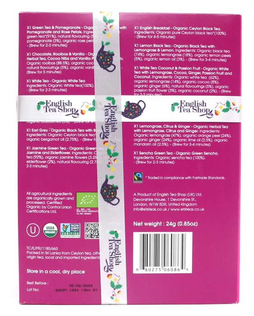 Smaki herbaty: Green Tea & Pomegranate/ Chocolate, Rooibos & Vanilla/ Pure White Tea/ Super Berries /Earl Grey /Jasmine Green Tea /English Breakfast /Lemon Black Tea/ White Tea Coconut & Passion Fruit/ Perfect Peppermint/ Lemongrass, Citrus & Ginger/ Sencha Green Tea