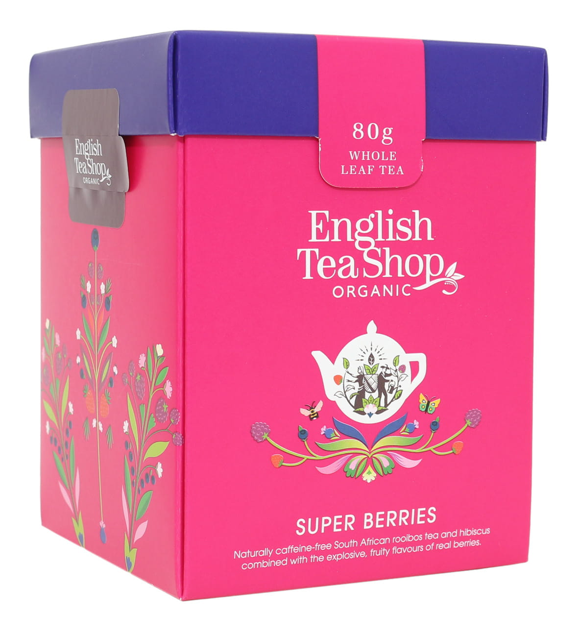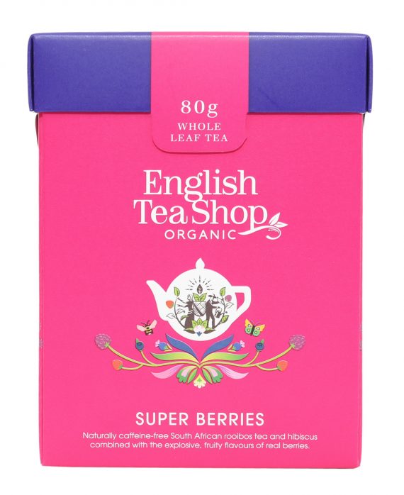Ekologiczna herbatka ziołowa z hibiskusa z truskawkami, borówkami i malinami. Składniki: Ekologiczny hibiskus (63%), ekologiczny rooibos (19%), aromaty naturalne (5%), ekologiczna mięta zielona (4%), ekologiczne maliny (3%), ekologiczne truskawki (3%), ekologiczne borówki (3%).