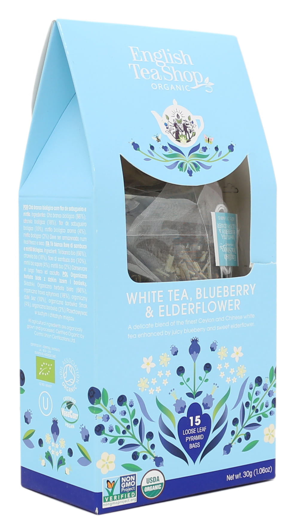 Ekologiczna herbata biała z dzikim bzem i borówką. Składniki: Ekologiczna herbata biała (66%), ekologiczna trawa cytrynowa (18%), ekologiczny dziki bez (10%), aromat naturalny (4%), ekologiczna borówka (2%).