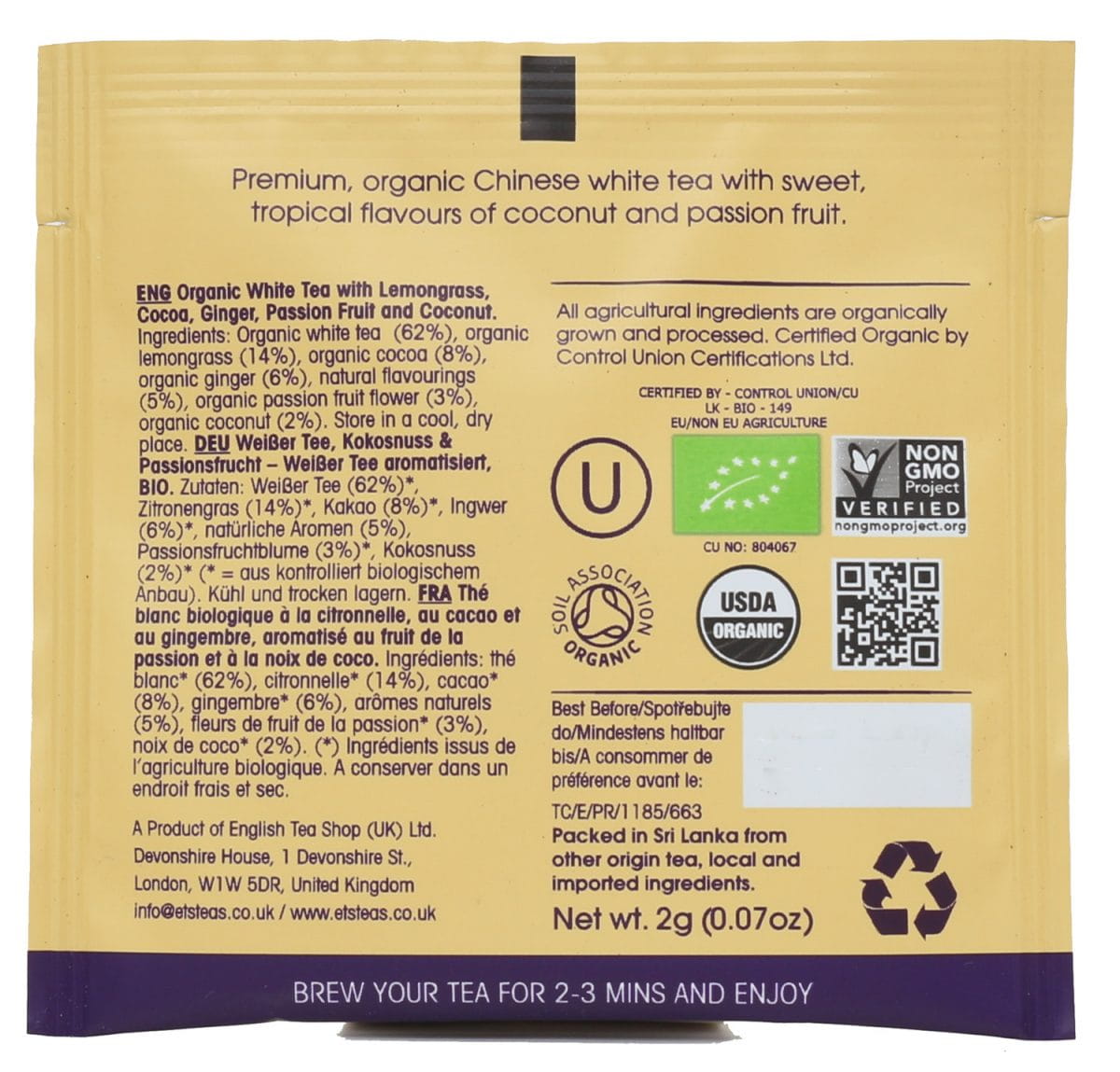 Ekologiczna herbata biała z trawą cytrynową, kakao, imbirem, marakują i kokosem. Składniki: ekologiczna herbata biała (62%), ekologiczna trawa cytrynowa (14%), ekologiczne kakao (8%), ekologiczny imbir (6%), aromaty naturalne (5%), ekologiczny kwiat marakui (3%), ekologiczny kokos (2%).