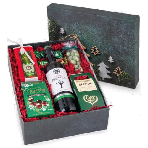 Całość jest starannie zapakowana w ręcznie kaszerowane pudełko ze świąteczną grafiką, które podkreśla świąteczny urok prezentu. Pudełko o wymiarach 28,5x36x10 cm doskonale sprawdza się jako upominek. Ponadto oferujemy możliwość personalizacji – dodaj własny napis, logo lub spersonalizowaną kartkę, aby uczynić świąteczny zestaw prezentowy jeszcze bardziej wyjątkowym.