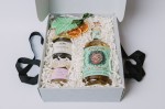 DEKORACJA Z SZYSZEK I PLASTRÓW POMARAŃCZY, PAPIEROWE WYPEŁNIENIE W KOLORZE BIAŁYM, KARTONOWE OPAKOWANIE W KOLORZE SZARYM, Z UCHWYTAMI W WYBRANYM KOLORZE