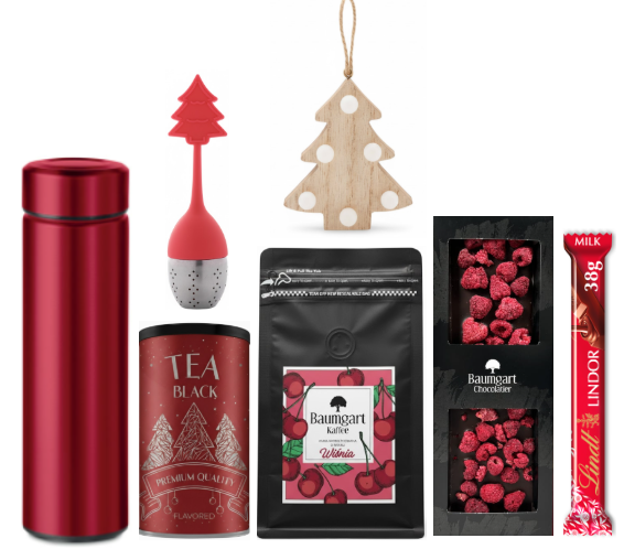 Pudełko obwiązane wstążką + dołączony bilecik z logo