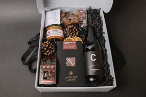 DEKORACJA Z SZYSZEK I PLASTRÓW POMARAŃCZY, PAPIEROWE WYPEŁNIENIE W KOLORZE CZARNYM, KARTONOWE OPAKOWANIE W KOLORZE SZARYM, Z UCHWYTAMI W WYBRANYM KOLORZE