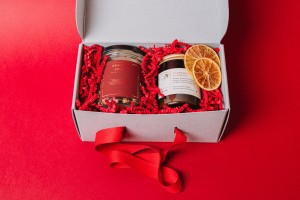 DEKORACJA Z PLASTRÓW POMARAŃCZY, PAPIEROWE WYPEŁNIENIE W KOLORZE CZERWONYM, KARTONOWE OPAKOWANIE W KOLORZE SZARYM, Z UCHWYTAMI W WYBRANYM KOLORZE