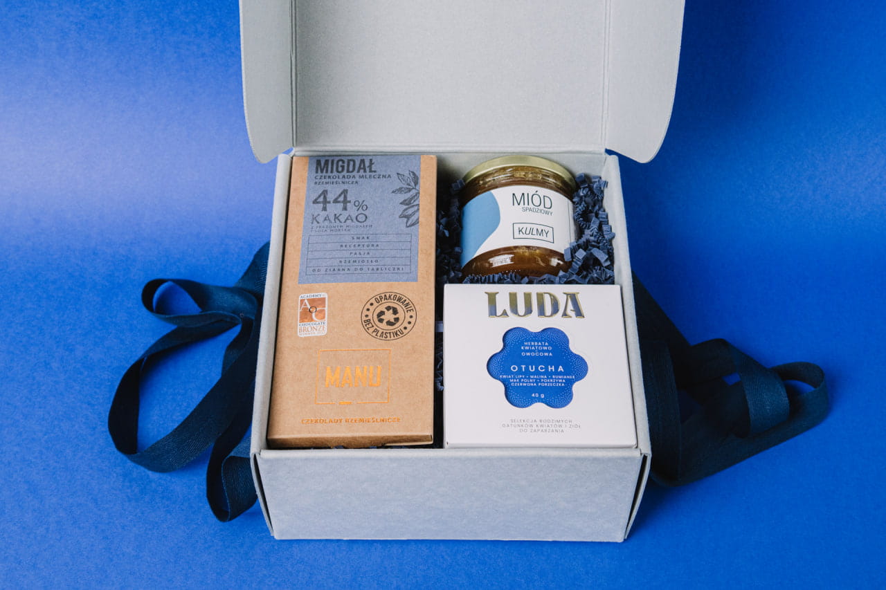 PAPIEROWE WYPEŁNIENIE W KOLORZE GRANATOWYM, KARTONOWE OPAKOWANIE W KOLORZE SZARYM, Z UCHWYTAMI W WYBRANYM KOLORZE