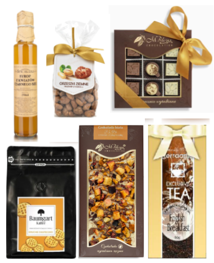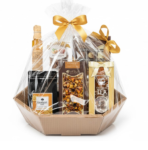 Zestaw dostarczany w formie kosza prezentowego owinięty celofanem przewiązanym złotą wstążką.