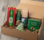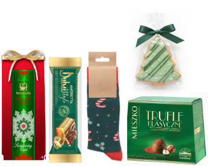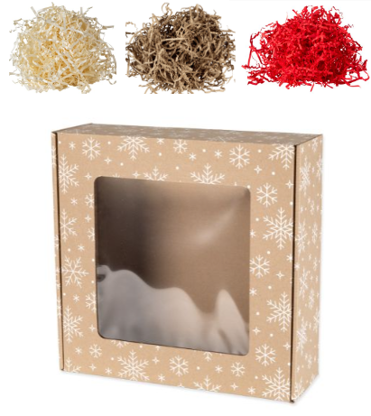 Zestaw zapakowany w pudełko z okienkiem z nadrukiem świątecznym.