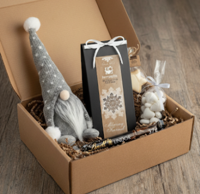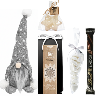 Zestaw zapakowany w pudełko z okienkiem z w kształcie choinki.