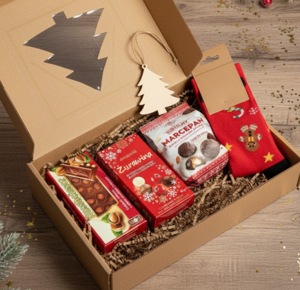 Zestaw pakowany w pudełko prezentowe z okienkiem w kształcie choinki